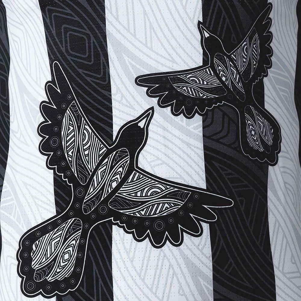 Join in the festivities of the indigenous culture with the Collingwood Magpies 2021 Men’s Indigenous Guernsey. Magpies are very nurturing in nature and guide their young and the roles of teachers, elders or respected person(s) are important to Aboriginal communities and families. We learn, listen and adhere to the teachings of our old people. Our cultural practices teach us values that we learn through connecting to stories, song, land, people and community and it guides everything we do. The magpies are flying onwards and upwards, with outstretched wings; reaching new heights and possibilities. Stay true to the indigenous culture in the Collingwood Magpies 2021 Men’s Indigenous Guernsey.There are gum leaves in the background pattern which represent cultural and personal growth. They meander like a river formation; signifying pathways and life’s journey. Gum leaves are significant to the Traditional Owners; the Wurundjeri of the Kulin Nation; whose land Collingwood is a part of. They are used in ‘Welcome to Country’ ceremonies and are extended to guests as a gesture of ‘Welcome.