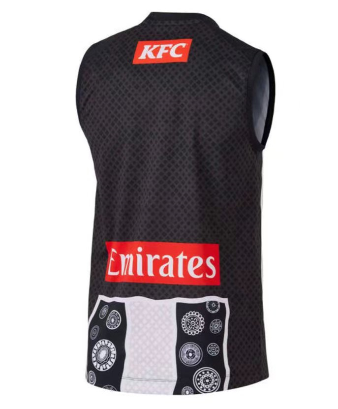 The Magpies began as a single VFL team. In 2023 the organisation housing eight teams in AFL, AFLW, VFL, VFLW, Netball, ANC, Wheelchair and Reclink, houses Next Generation Academies, and has a wide community outreach. The Collingwood Magpies 2023 Indigenous Guernsey celebrates the wide ranging communities and individuals that make up the club. Tarni Jarvis’s design features circles within the black stripes on the guernsey. Each circle is unique and represents the people, and their stories, that make up the Club. Crosshatching – a commonly used technique within Aboriginal artwork in the southwest region of Victoria – is used to create the white stripes of the jumper.