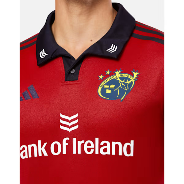 Display your passion on or off the field in a version of the adidas home jersey Munster Rugby players wear on match days. Featuring a design inspired by the 20th anniversary of Munster’s first European Cup Final win, the jersey showcases the three crowns and stag from the Munster Rugby crest, enhanced by striking gold detailing. Two stars sit above the logo, representing the club’s European Cup victories in 2006 and 2008. Crafted from comfortable yet resilient piqué fabric, this jersey combines performance with style. A club badge on the chest proudly displays your rugby allegiance.