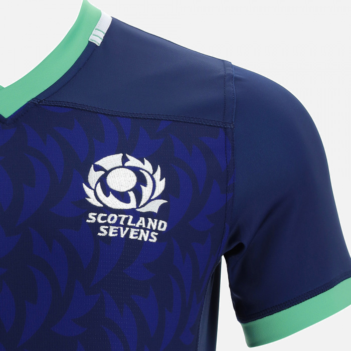 The Scotland Rugby 2021-22 Home 7s Replica Jersey. Navy shirt with thistle leaf pattern panels across the center panel, green details on the collars and cuffs and the Scottish Rugby Crest embroidered over the heart.This shirt is standard fit, with short sleeves and produced using polyester making it perfect for cheering on the squad from the stands.